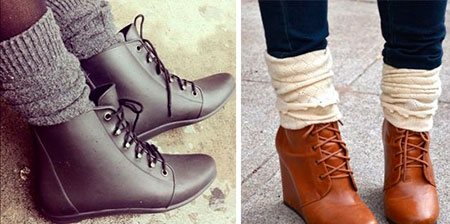 При помощи широких сапог с халявами и гетрами можно скрыть некоторые недостатки своих ног. Предпочтительно выбирать чулки со складками, которые будут визуально скрывать неровность ножек, на фото ниже наглядно показано, как это лучше сделать. Сапоги со стороны смотрятся свежо и очень стильно. Носить гетры с ботинками можно как на высоком каблуке, так и плоской платформе.